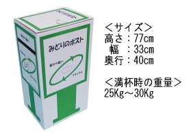 みどりのポストは、ポストごと溶解処理を行い、再生紙の原料として再利用しています。 みどりのポスト 1ケース分の紙で、CO2が21kg削減されます。 みどりのポスト 2ケース分の紙で、緑の木が1本切られずにすみます。 みどりのポストは、普及しているシュレッダーよりも経済性が高く、地球環境にも優しい紙の処理方法なのです。 |