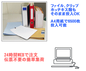 ポストに投函する文書は、分別不要です。 ファイル、バインダー、クリップ類などもそのまま投入して頂けます。 カーボン紙、切符などの難処理古紙もOKです。 A4用紙で、約6500枚入ります。 無選別で、大容量な為、今までシュレッダー処理にかけていた時間を 大幅に節約できます。 諸費用を計算すると、シュレッダー処理をする場合に比べてはるかに経済的です。 みどりのポストはお待たせしません。 ポストの注文も溶解処理の依頼も、24時間WEBから行えます。 処理後の溶解証明書発行もWEBから行えますので安心です。 |