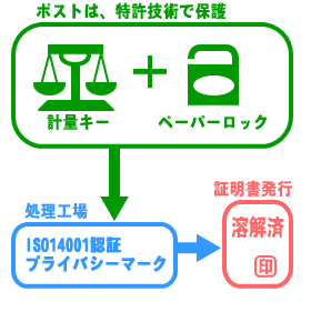 独自の特許技術である「計量キー」と「ペーパーロック」で2重に保護されるため、 事業所への設置から工場での溶解処理まで、未開封である事を保証します。 さらに、ハードケースや専用人員が不要で経済的です。 溶解処理は、ISO14001認証+プライバシーマーク取得済みの製紙工場で行われます。 工場内には一切積み置きせず、未開封のまま溶解処理されます。 高セキュリティでありながら、経済的なみどりのポストは、他社に類を見ないサービスです。 |