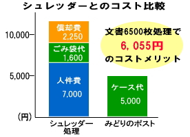 シュレッダーよりも経済的で、地球にも優しい。 それが「みどりのポスト」です。 【用紙6500枚処理した場合の試算】 ・シュレッダー処理にかかる費用 (シュレッダー購入費・作業人件費・ごみ袋代) ¥11,055 ・みどりのポスト処理にかかる費用 ¥5,000 のみ コストメリット ¥6,055 |